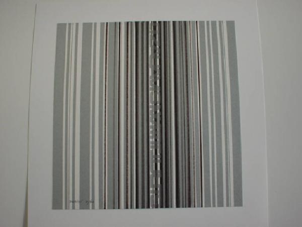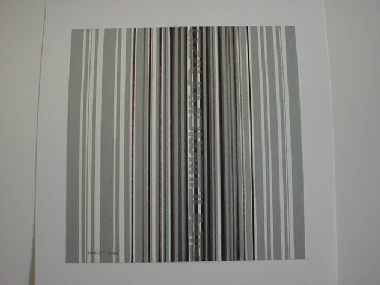 Il fondo bianco del cartoncino è percorso in senso verticale da una serie di linee di colore grigio chiaro, grigio scuro e nero tra le quali si inscrive in dissimmetria dinamica una scritta in lettere capitali disposta in verticale.