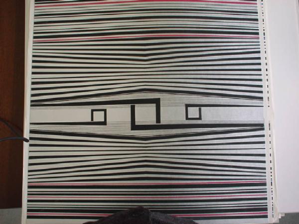 Su di un fondo color bianco si inscrivono una serie di linee verticali ad andamento leggermente paraboloide (concavo e convesso), cinque di colore rosso e le altre nere, che convergono verso verso uno spazio nero argentato, posto in dissimmetria dinamica