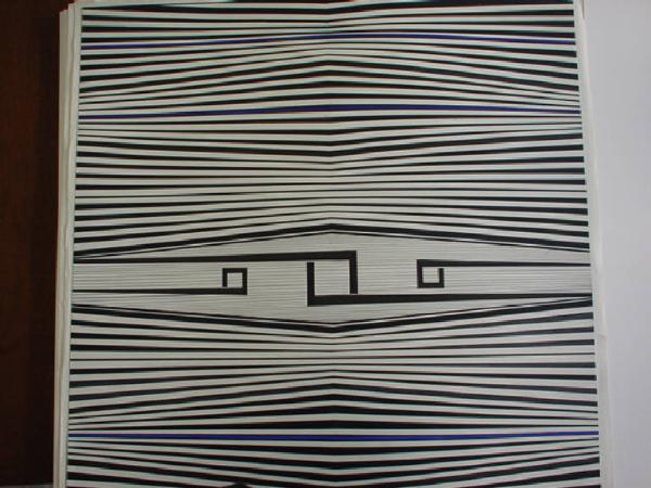 Sul fondo argento sono tracciate linee blu e nere ad andamento verticale; quelle centrali sono progressivamente inclinate variando lo spessore fino a formare una losanga disposta in dissimmetria dinamica