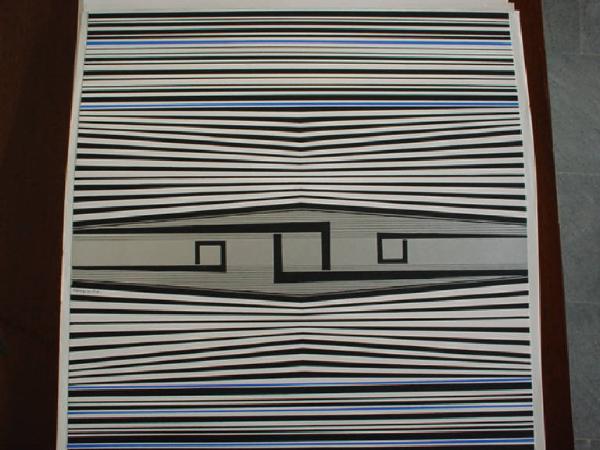 Sul fondo argento sono tracciate linee blu e nere ad andamento verticale; quelle centrali sono progressivamente inclinate variando lo spessore fino a formare una losanga disposta in dissimmetria dinamica