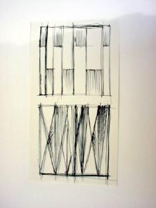 Sono tracciati due spazi rettangolari, uno sovrapposto all'altro, entro cui si dispongono forme rispettivamente rettangolari e romboidali nel rispetto della dissimetria dinamica. Probabilmente sono i disegni in pianta e in prospettiva di una stessa struttura