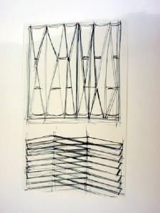 Sono tracciati due spazi rettangolari, uno sovrapposto all'altro, entro cui si dispongono forme rispettivamente romboidali, suddivise a tre altezze diverse da una linea orizzontale, e rettangolari oblique. Probabilmente sono i disegni in pianta e in prospettiva di una stessa struttura