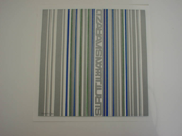Entro un fondo trattato con l'impiego di fitte righe verticali parallele di diverso colore, emerge una scritta di fantasia , allineata anch'essa in verticale, in dissimmetria dinamica. La scritta è composta da caratteri a bastone.