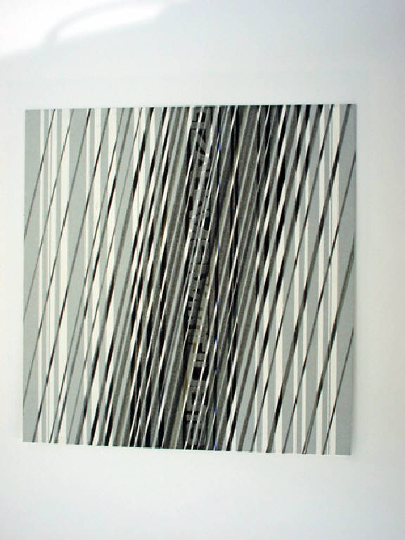 Sovrapposte a scritte in verticali - volutamente illeggibbili - sono fitte righe oblique parallele nelle tonalità di nero e grigio