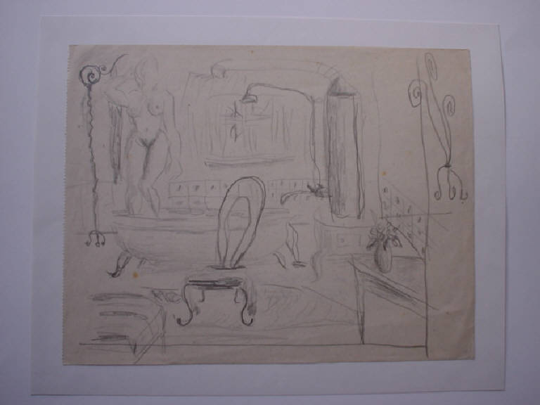 Rappresentazione dell'interno di un bagno dai tratti espressionistici, e per la rappresentazione non in regolare prospettiva degli oggetti della toilette , e per la loro disposizione affastellata nello spazio. Si intravede anche un nudo femminile sulla sinistra.