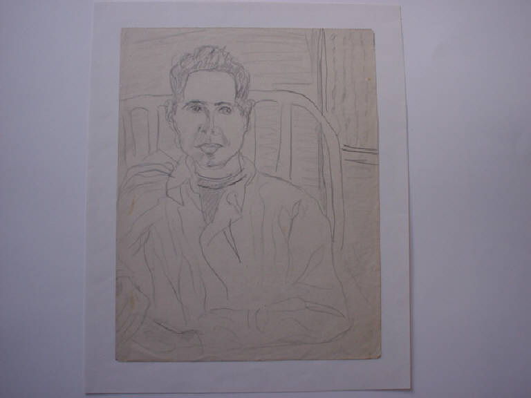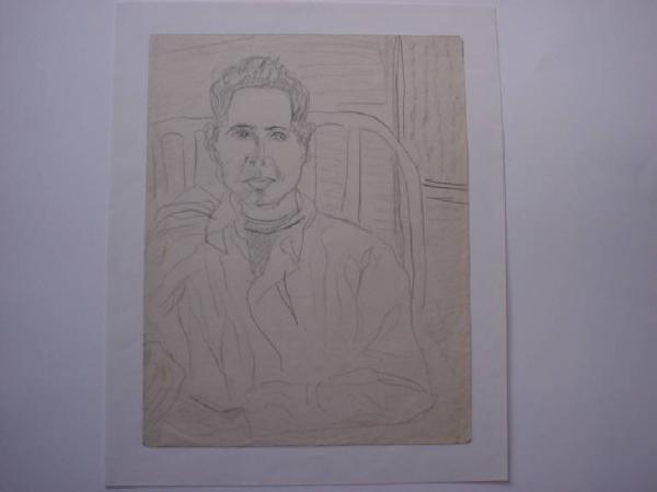 Ritratto frontale del pittore, a mezzo busto, seduto su una sedia in un interno (si intravede una finestra sullo sfondo) La fisionomia è molto più caratterizzata e meglio definita rispetto al busto e allo sfondo, trattato a linee molto libere.