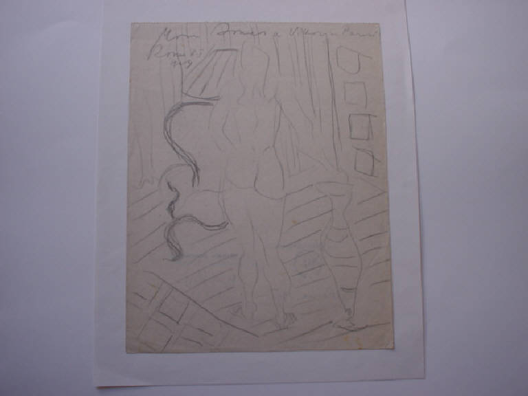 Nudo femminile di spalle, ripreso in un interno. La prospetiva adottata è quella dall'alto. Gli oggetto sono definiti senza una definizione regolare della prospettiva e della volumetria in relazione ad essa. Il tratto a matita è molto libero.