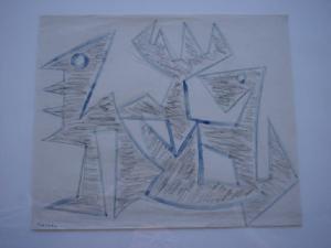 Composizione astratta formata dalla combinazione di due diverse tecniche e colori : la grafite nera e l'inchiostro diluito blu per i contorni della figura