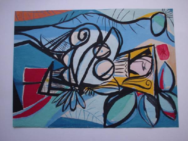 Con il colore nero eil giallo per la chioma è suggerita la figura femminile, con poche linee curve. Il resto dello sfondo è trattato a tinte forti di azzurro, verde, rosso e giallo, con motivi decorativi di segno astratto.