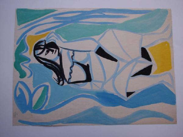 Con il colore nero è suggerita la figura femminile, con poche linee curve. Il resto dello sfondo è trattato a tinte forti di azzurro, verde e giallo, con motivi decorativi di segno astratto.
