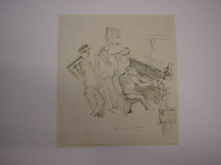 Con tratto calligrafico e molto libero è ritratto un gruppo di persone attorno a un amico che suona al pianoforte. L'autore si avvale di leggere acquarellature per dare maggiore volume alla scena.