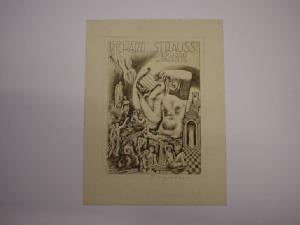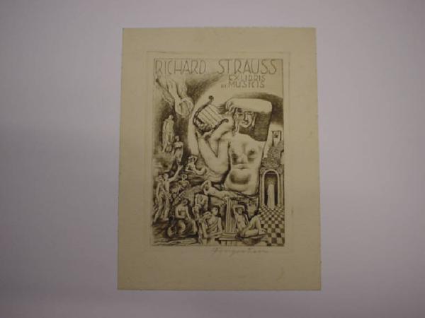 Scena di gusto liberty, con un paesaggio lunare e particolari di un giardino con architetture classiciste