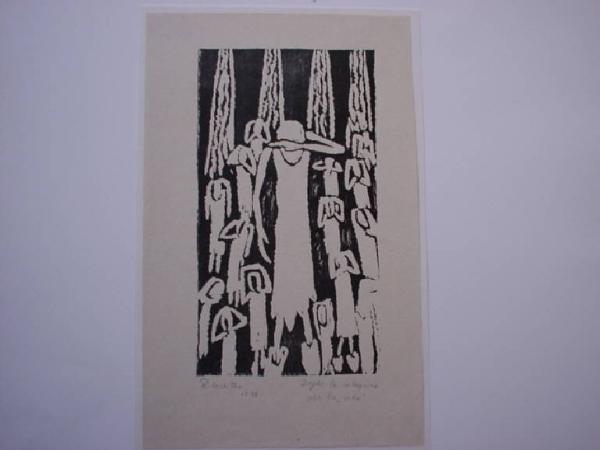 in "negativo" sono definite a disegno lineare le silhouette di figure umane in diversi atteggiamenti di difesa, soprattutto con l'uso espressivo degli arti superiori.