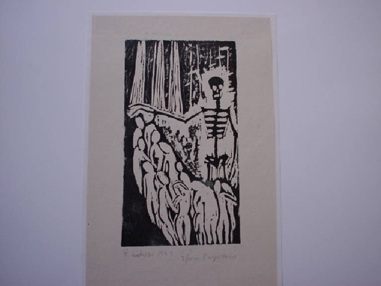 In "negativo" è disegnato un gruppo di figure umane di spalle, che si reca compatto in un'unica direzione. Sulla destra è raffigurata la morte.