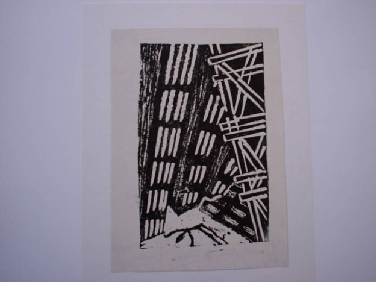 Rappresentazione ai limiti del figurativo di una veduta prospettica architettonica entro cui è collocata la sagoma di una figura umana.