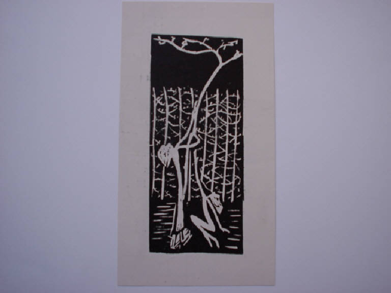 In "negativo" è definita a disegno la silhouette di un albero, dal trongo allungato, ai cui piedi giace una figura umana stilizzata.