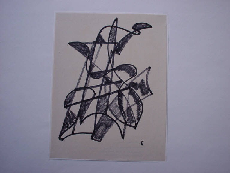 Una forma astratta, realizzata per mezzo di un largo tratteggio incrociato curvilineo, presenta al suo interno alcune zonature campite completamente di colore nero