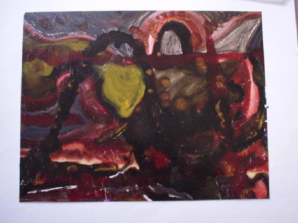 Il piano è interamente campito di colori terrosi e caldi (bruno, verdone, rosso fuoco) a dare l'idea dell'energia di un fenomeno naturale come l'eruzione di un vulcano
