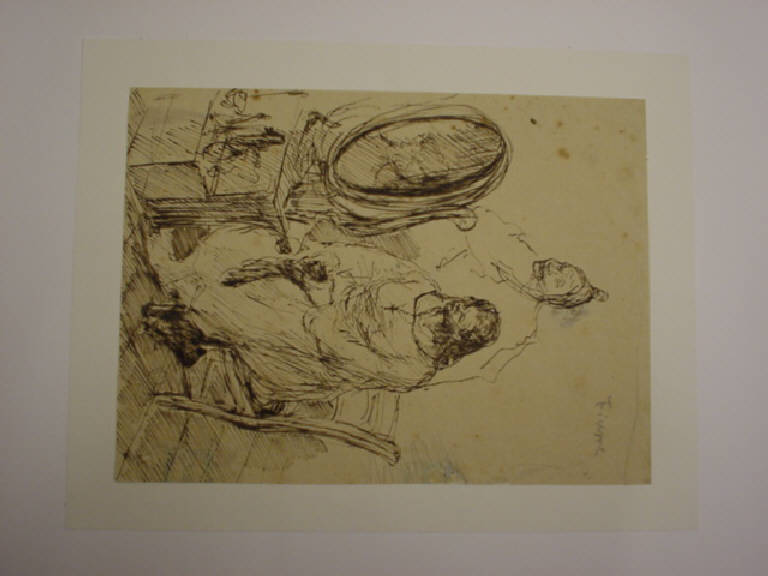 Ritratto della propria madre rivolta verso lo specchio. Superiormente si intravede un altro volto femminile, ma più invecchiato.