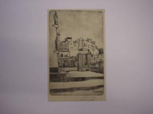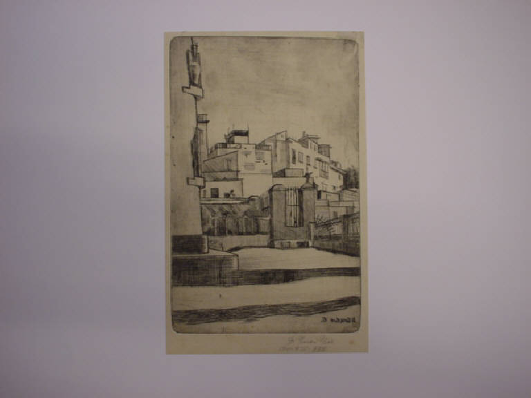 Adottando un taglio verticale, l'autore riproduce un angolo di paesaggio urbano, con una forte tensione a geometrizzare gli impianti architettonici