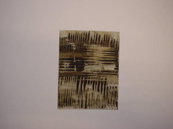 L'uso sapiente dell'inchiostro fa comporre a Zannerio una texture di raffinato valore tonale - nella gamma degli ocra - basata sulla reiterazione di un motivo a triangolo isoscele molto allungato.