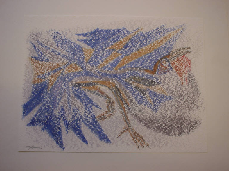 Con la tempera vaporizzata è suggerita la forma di un gallo con il suo piumaggio vaporoso. I colori utilizzati sono il blu e l'arancio in diverse gradazioni