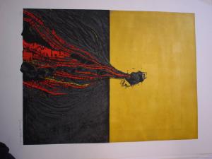All'interno di un fondo suddiviso in un area inferiore gialla, e una superiore nera, campeggia una forma astratta di colore rosso. La cromia e la forma sembrano alludere ad una colata di lava incandescente