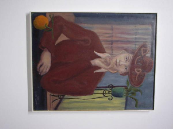 Ritratto femminile a mezzo busto in un interno domestico. La modella ha un cappello a falde larghe e una camicia abbinata di colore rosso.
