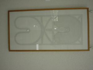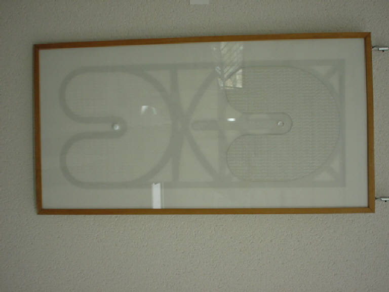 Con bottoni, ritagli di pizzo, cotone e cartone l'autore ha composto un assemblato bidimensionale esteso in altezza.