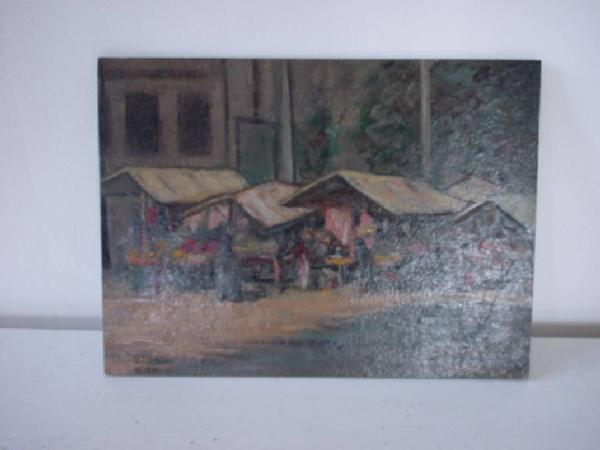 L'opera raffigura un mercato, ma l'immagine è delineata non per identificazione figurativa ma per accostamento e giustapposizione di macchie di colore che ne consentono la lettura globale. Vi è una prevalenza di colori scuri (grigio, verde, blu) su cui risaltano i colori vivaci con cui sono rappresentate le forme del mercato.