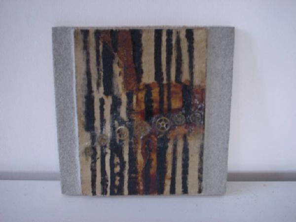 Su un piano bidimensionale trattato a silicato grigio chiaro misto con sabbia bianca si inscrive a rilievo un modulo rettangolare con andamento verticale in leggera dissimmetria dinamica. Tale modulo è matericamente interessato da una superficie in lana sulla quale sono applicati due elementi in seta e carta per collage e una serie di elementi circolari metallici (in realtà ingranaggi di orologio) con andamento paraboidale orizzontale, fermati con collante speciale semitrasparente.