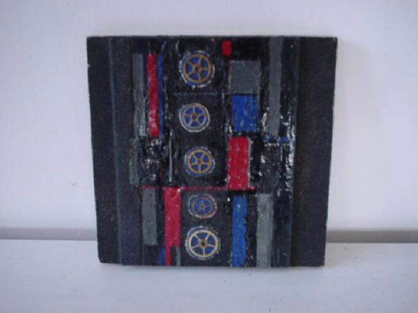 E' presente un modulo rettangolare in rilievo ad andamento verticale in dissimmetria dinamica. Lo sfondo è trattato a smeriglio grigio scuro. Il modulo presenta una serie di campiture trattate a smalto nero, blu e rosso - in alcuni punti matericamente rilevante - sui quali si innestano cinque elementi metallici stellari (ingranaggi di un orologio)