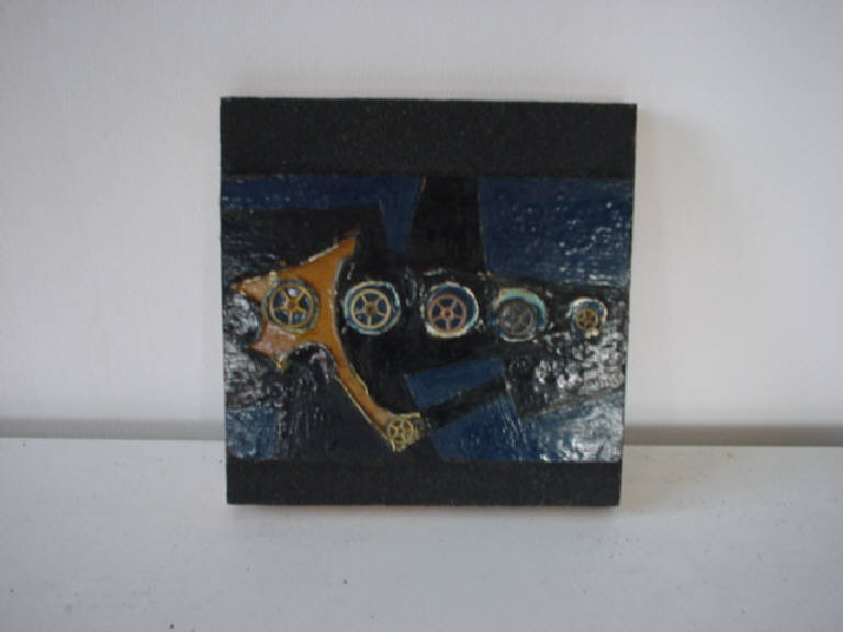 smeriglio/ smalto/ elementi plastici e legno su tavola