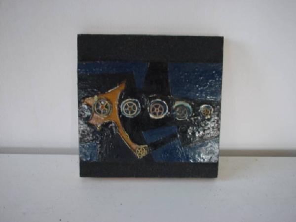 Su un piano bidimensionale trattato a smeriglio di colore grigio scuro si inscrive a rilievo un modulo rettangolare con andamento verticale in leggera dissimmetria dinamica. Quest'ultimo presenta forme pseudogeometriche poligonali irregolari cromaticamente trattate a smalto nero e blu, alcune delimitate nei loro confini da un leggero rilievo. Su queste forme si inscrivono elementi circolari stellari