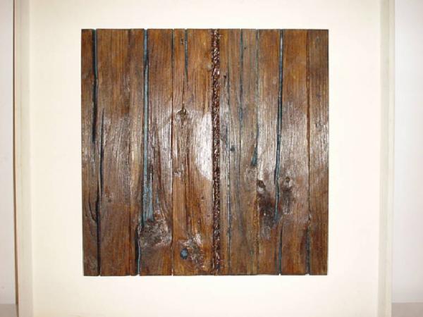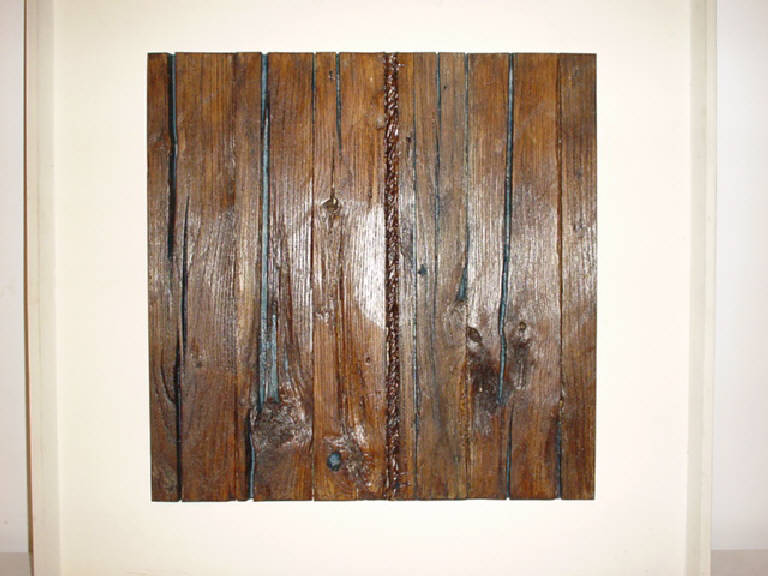 Su due tavole sovrapposte di legno antico è applicata una corda trattata in colore bruno e vernice trasparente.Gli interstizi della tavola sono trattati in smalto blu
