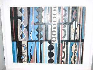In lunghezza si susseguono zonature verticali nei colori nero, grigio, bianco, azzurro e rosa. Lo spazio dell'opera appare tagliato da una linea orizzontale