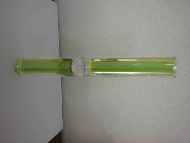 Due cilindri cavi sovrapposti contengono due parallelepipedi allungati di colore verde; tra un cilindro e l'altro, a metà altezza, è disposta una sfera trasparente di diametro identicio al cilindro esterno