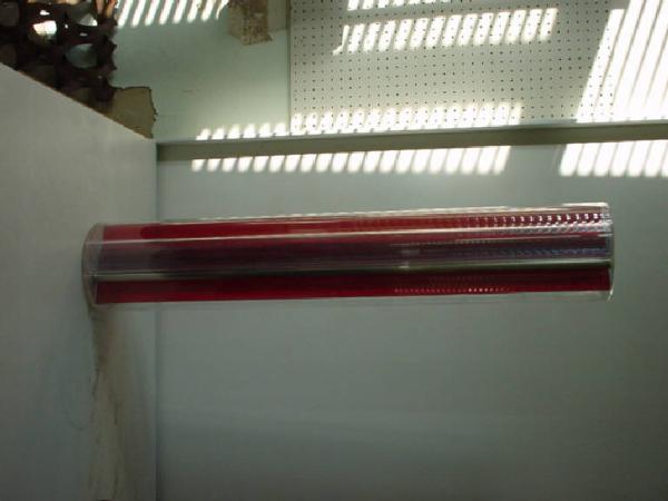 Assemblaggio poliplastico all'interno di un modulo tubolare trasparente. L'assemblaggio è costituito da una lamina rettangolare in polimetacrilato rosso e tre elementi tubolari, due blu e uno in acciaio.