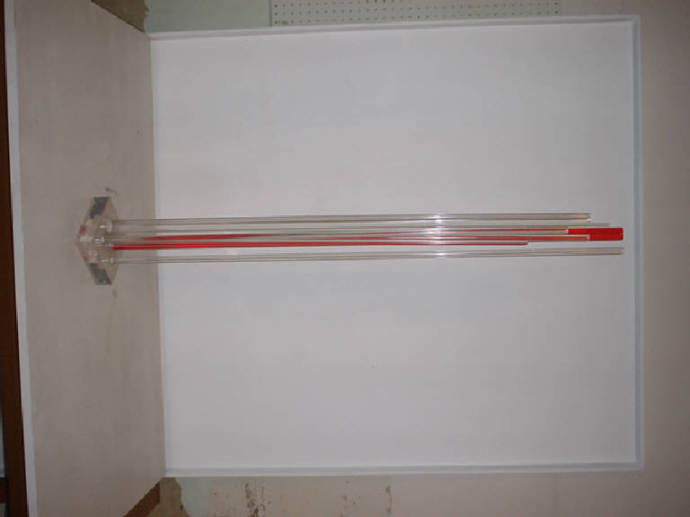 Sulla base in polimetacrilato trasparente sono inseriti moduli tubolari a forte sviluppo verticale di diverso diametro e altezza, dei quali sei sono in polimetacrilato trasparente e uno più ampio in polimetacrilato rosso