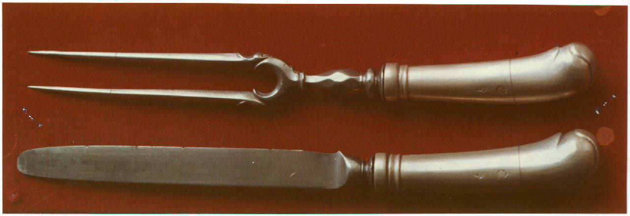 Servizio da trinciante composto da forchettone e coltellone: aderenze in acciaio, manico liscio, a pistola, a sezione circolare; colletto ad anelli