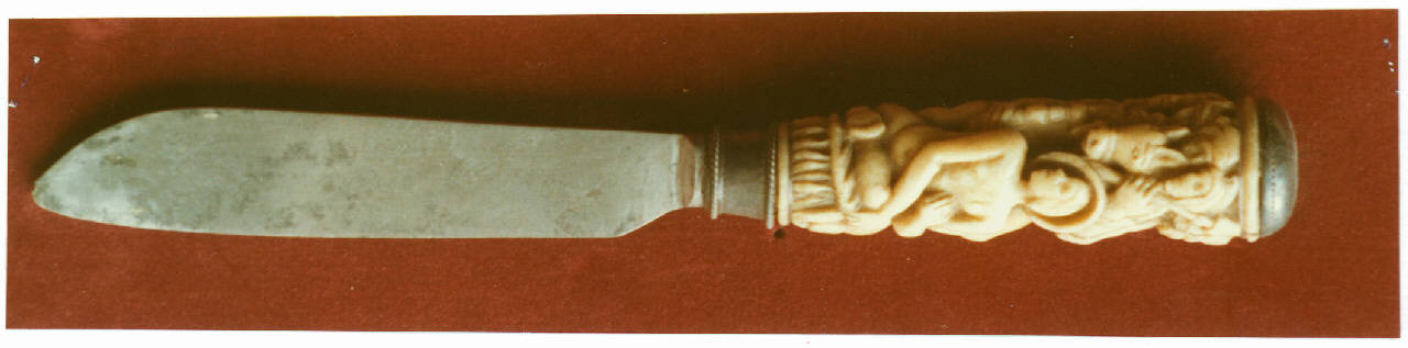 Coltello da trinciante: aderenze e capsula al terminale in acciaio; manico cilindrico leggermente rastremato, in avorio intagliato con la raffigurazione in rilievo del martirio di San Lorenzo