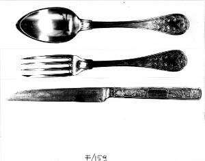 - NOTIZIE STORICO CRITICHE Come attestano i punzoni, il coltello, di gusto Impero, è stata realizzato a Parigi tra il 1809 e il 1819. Il punzone di bottega con la raffigurazione del caduceo potrebbe essere ascritto a Jean Toulon, che depositò il proprio marchio nel 1789 conservandolo fino al 1813 quando cedette l'impresa a L. Chatenet. In questo caso le posate sarebbero state realizzate entro questa data La foggia segue il modello "Old English", i decori a rami d'alloro si ispirano al gusto neoclassico