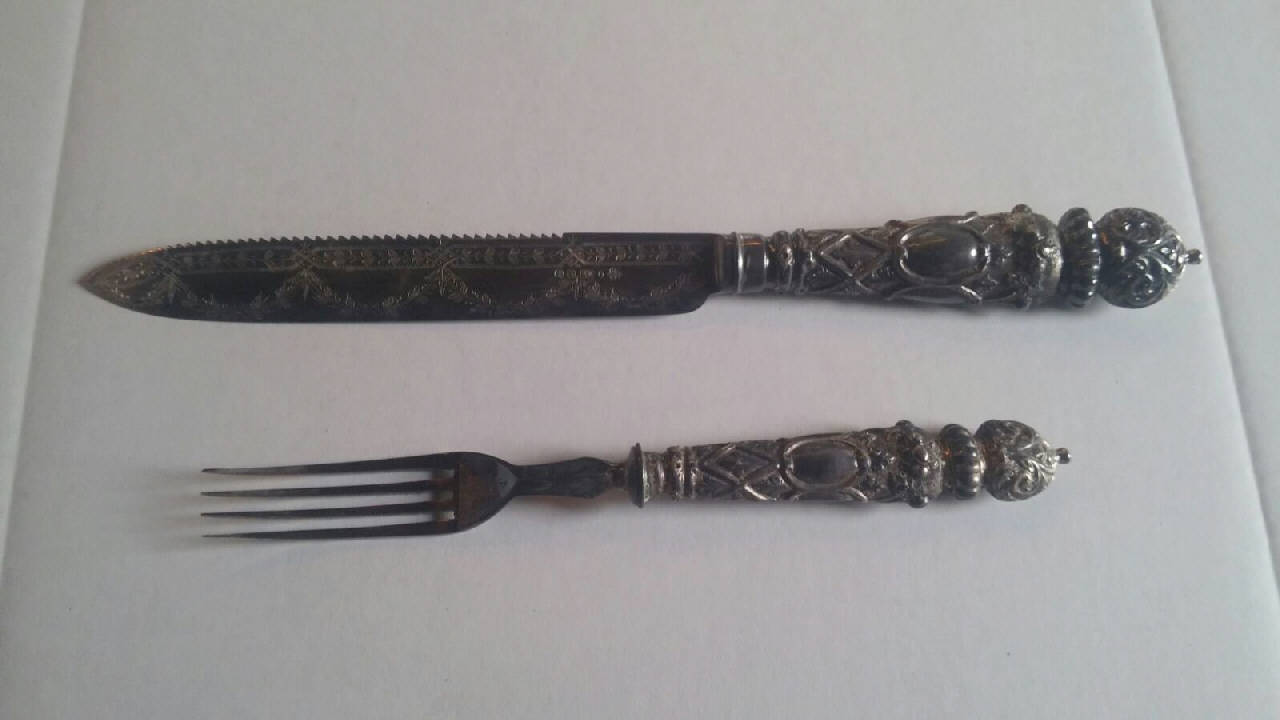 - NOTIZIE STORICO CRITICHE I coltelli, vistosamente ornati secondo il gusto eclettico tipico dell'epoca vittoriana e registrate, come attesta il marchio in data 29 aprile 1875, vennero prodotte in "Sheffield plate" dalla rinomata ditta di Sheffield Richard Martin & Ebenezer Hall, il cui punzone di fabbrica compare anche su un coltellone e un forchettone di identica fattura conservati nella collezione Sambonet