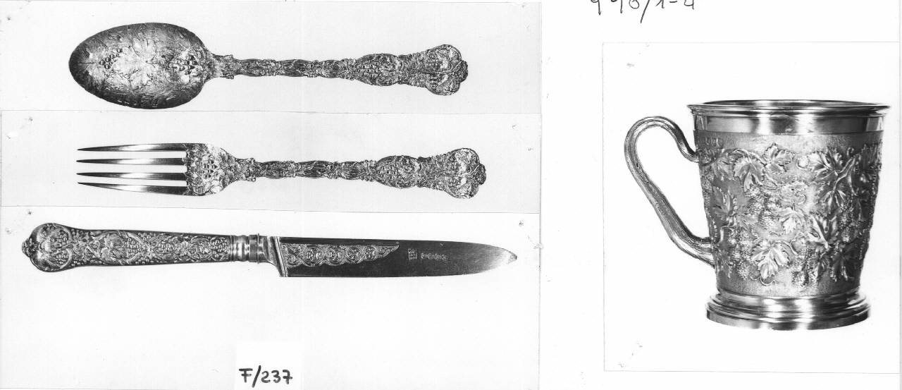 Coltello in argento dorato con lama incisa a girali vegetali in campo triangolare e ricca ornamentazione a tralci di vite e grappoli d'uva in bassorilievo sul manico, a sezione ovale e sagomato