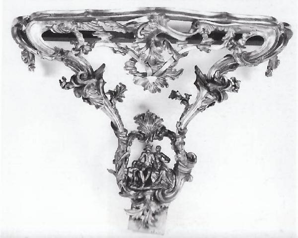 Le volute, intrecciandosi, formano il supporto del piano di marmo e incorniciano una scenetta galante intagliata a tutto tondo.