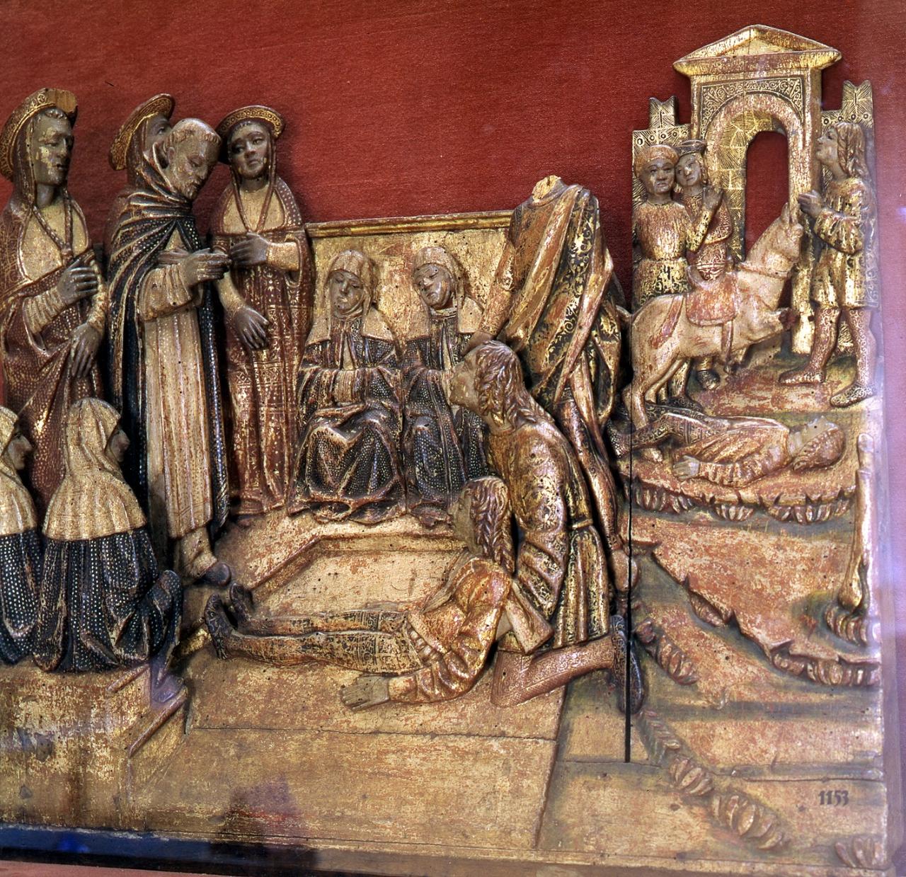 Altorilievo policromo con la rappresentazione della scena del Miracolo di San Domenico che resuscita Napoleone Orsini caduto da cavallo. La scena mostra il santo di profilo, attorniato da tre monaci, con la mano destra protesa in atto di benedire il nipote del cardinale Ceccani, prono a terra e sostenuto da un servo inginocchiato, dietro questi è un altro personaggio mancante della testa. A sinistra, due monache sedute assistono alla scena dando le spalle al riguardante, mentre a destra, in secondo piano, viene riprodotta la scena dell'incidente occorso. Sullo sfondo, un edificio descritto attraverso il solo arco di accesso presso cui sono tre servi in piedi che guardano il cavallo imbizzarrito e più in basso il cavaliere disarcionato.