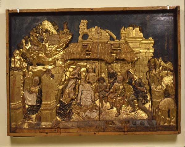 Rilievo ligneo raffigurante la Natività inserito in una cassa probabilmente originale. Al centro la Vergine protesa in adorazione del bambino, adagiato su un lembo del manto sorretto da un angelo inginocchiato, dietro sono tre angeli: due in preghiera e quello al centro suona uno strumento. A destra si dispongono in sequenza un pastore adorante con le mani intrecciate al petto, san Giuseppe e un altro pastore. Lo sfondo è costituito da un edificio in rovina e da un paesaggio montano ove si vedono animali al pascolo. Nel margine sinistro è la figura della levatrice che stende il panno accanto al fuoco.