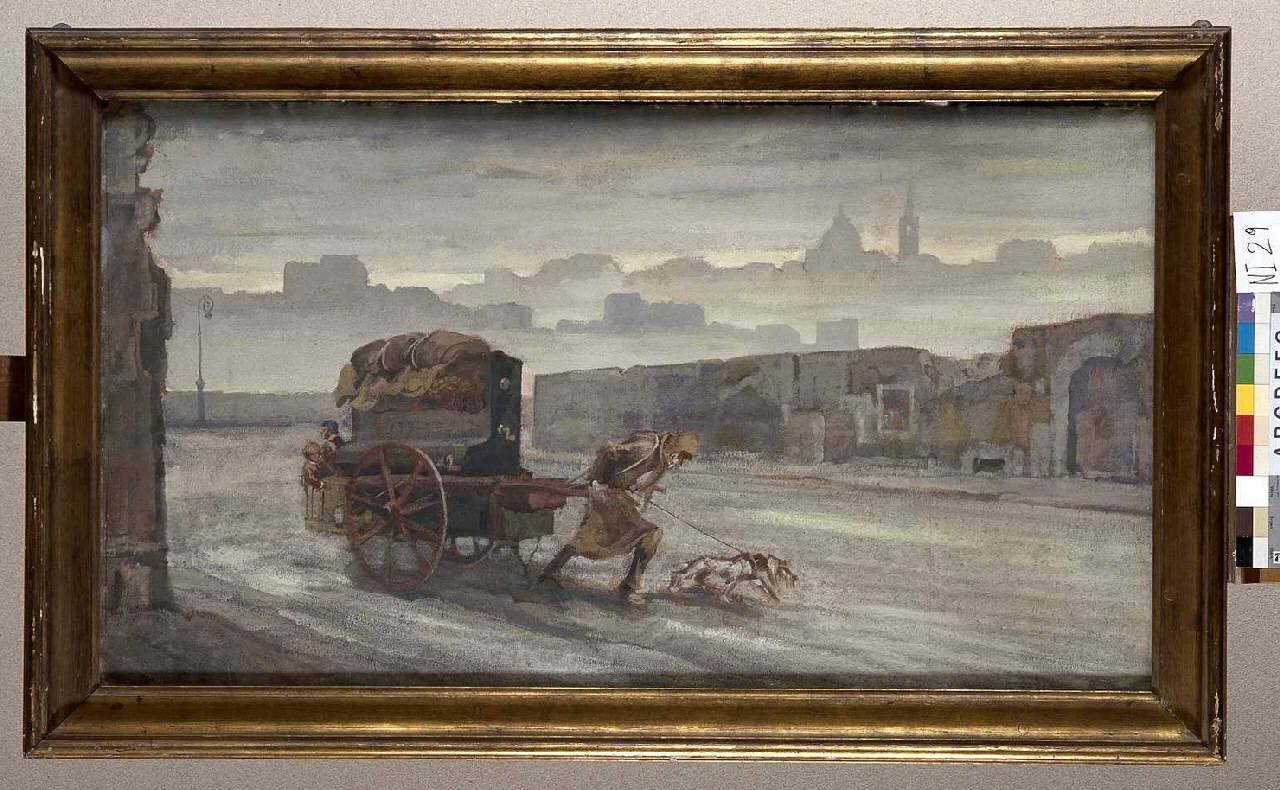 La strada senza fine (Passa la miseria). Uomo che tira un carretto con mobilio e due bambini