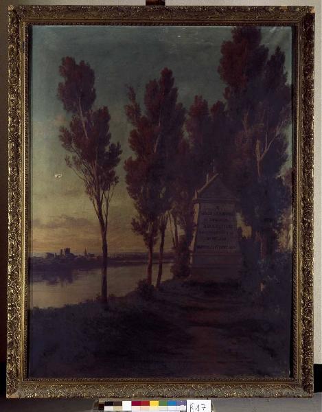 Allegoria in memoria di Spiridione Gialdi. Paesaggio fluviale con monumento funebre