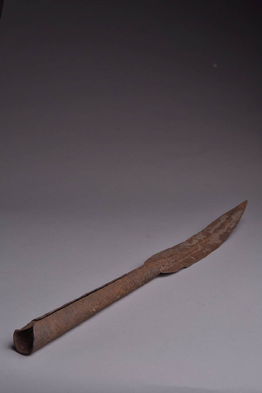 Ferro di lancia con cuspide a foglia con forte nervatura centrale terminante in una gorbia troncoconica aperta.